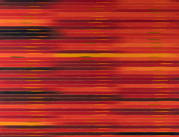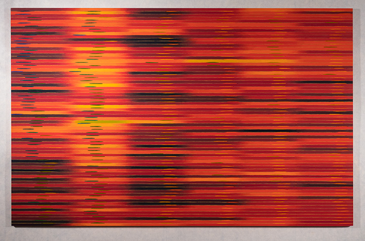 Each painting contains 72 quarter-inch stripes stacked chronologically, with six cities per panel moving west to east.
