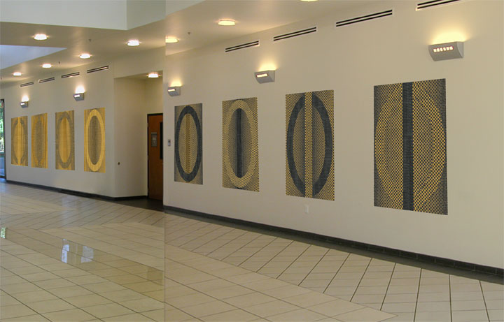 Pixilated Binaries is a suite of 8 multilayered panel paintings proposed for the lobby of a new engineering building at the University of Central Florida in Orlando. The imagery for these paintings utilizes the binary code, by composing the rectangular panels with the numbers 0 and 1. For several years Debra has been exploring how to visually create representations of space through painted and fabricated patterns of squares or rectangles. These patterns work in a similar way that pixels work to create illusion, creating a range of solid areas to spatial areas depending on the color and/or quality of the combination of squares/rectangles.
