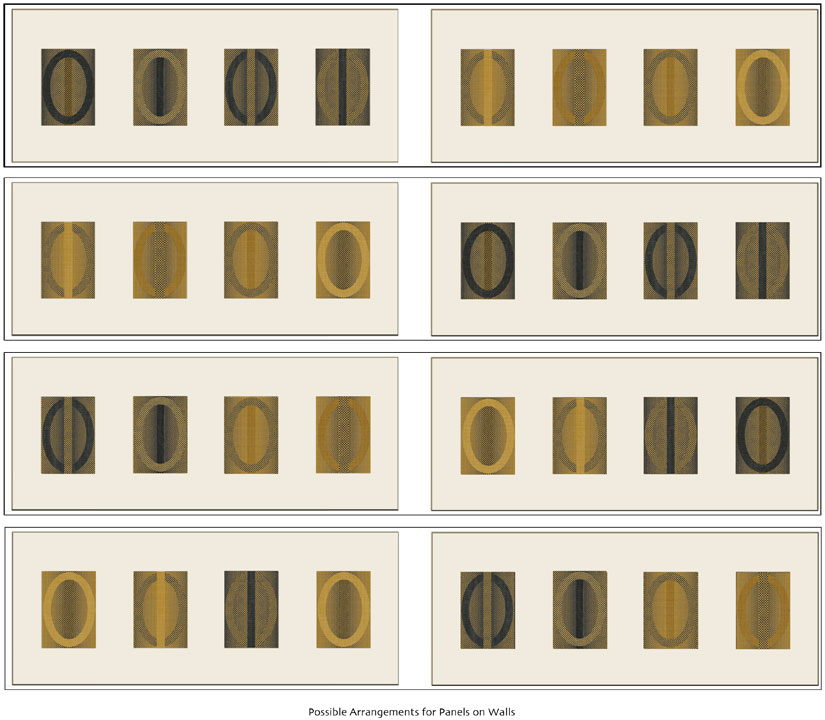 The imagery takes place on 3 layers of ¾” board. The back board depicts an 0 or 1, the front board depicts an 0 when a 1 is in the back or a 1 when an 0 is in the back. These 0’s and 1’s are always painted as extremes where all the squares are black or all the squares are gold or the squares alternate between the two. This makes the 0’s and 1’s have a solid feeling when one color is used, or an open feeling when two opposing colors are used. The mid panel creates a vertical landscape atmosphere in the space amid the 1’s and 0’s. Here the paint gradates between the all black squares to black/gold squares to all gold squares. The pictorial possibilities seem endless. This endless feeling is expressed in these 8 paintings through both illusion and the physical layers where the 0 and 1 reside.